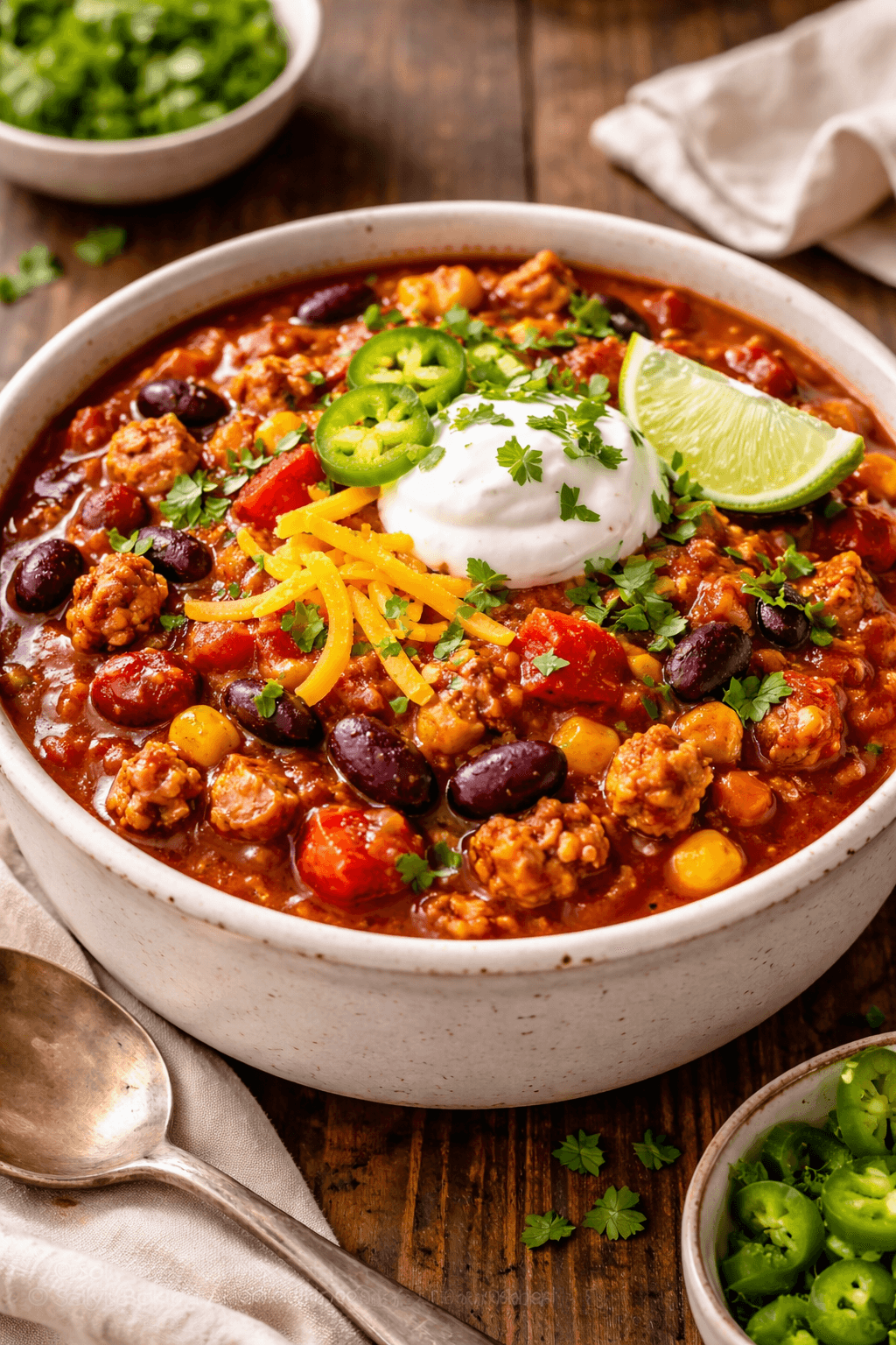 Ground turkey is a lean protein that absorbs spices beautifully while keeping the dish lighter than traditional beef chili.