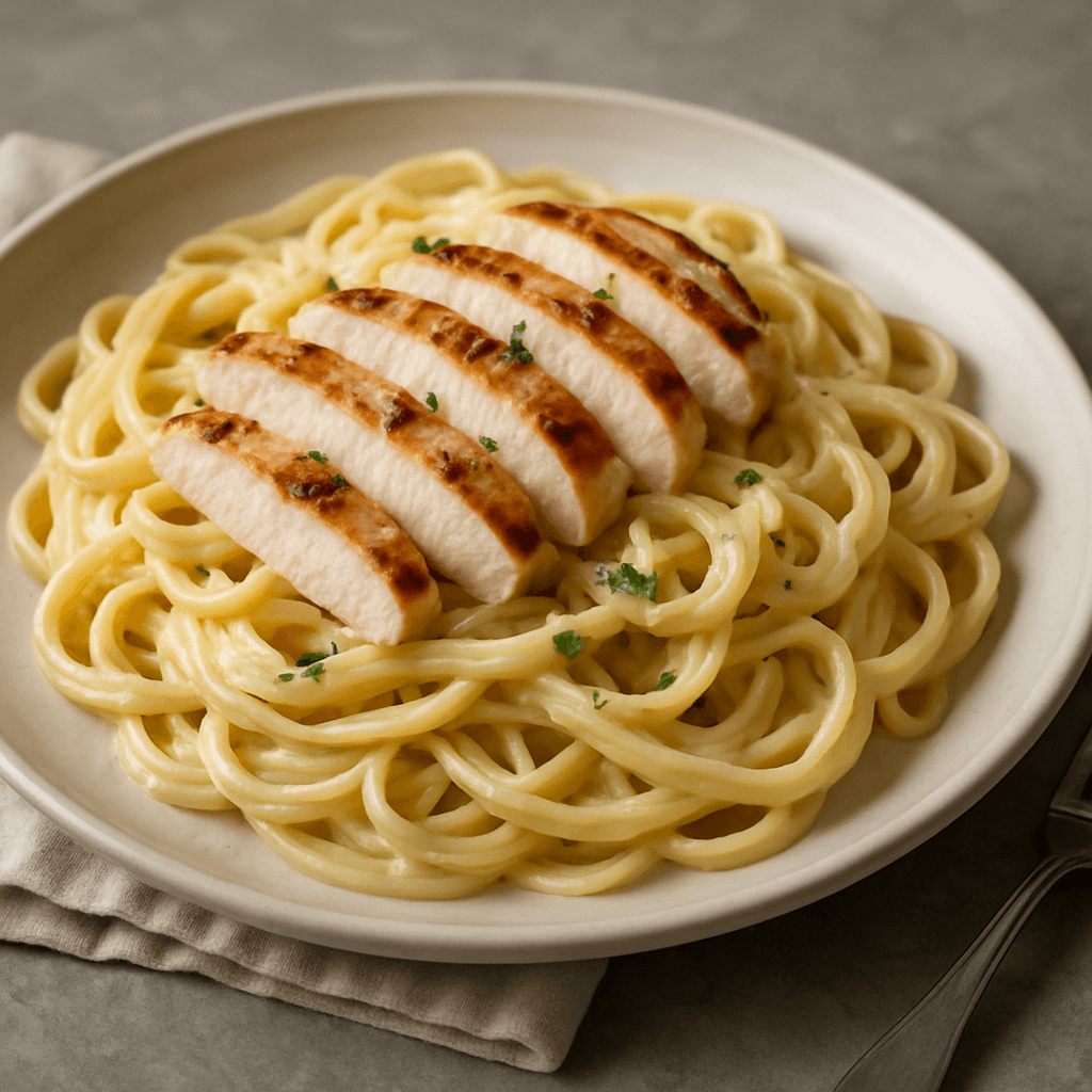 Add the cooked pasta and sliced chicken to the sauce, tossing gently to coat evenly. If the sauce is too thick, add reserved pasta water a tablespoon at a time until desired consistency is reached. Garnish with extra Parmesan and fresh parsley if desired. Serve immediately.