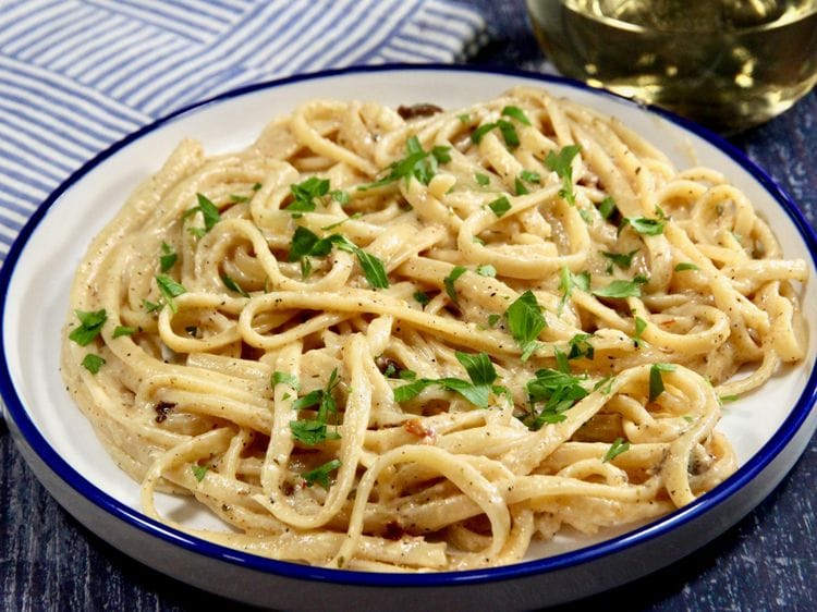 3. Add linguine, and toss until well coated. If a bit thick, add pasta water a teaspoon at a time to reach your desired consistency. Season with black pepper, garnish with parsley or green onions, and serve.