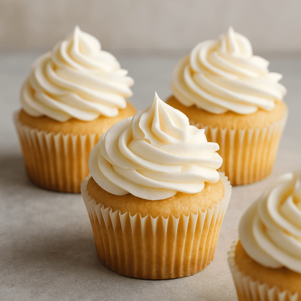A classic vanilla buttercream frosting pairs perfectly with these cupcakes. Here’s a simple recipe: